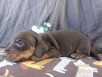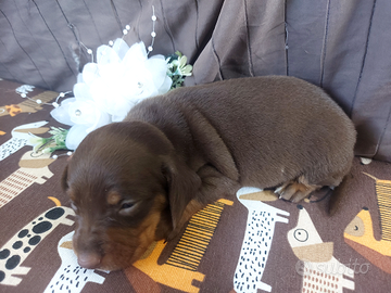 Splendida cucciola femmina di bassotto cioccolato nata il 25 /12 /2025 e disponibile dalla fine di febbraio con due vaccini, microchip, trattamenti antiparassitari interni ed esterni, certificato di buona salute e pedigree , genitori isabella e piebald isabella, futura taglia nana.