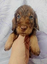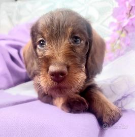 Disponibile in allevamento cucciola di bassotto nano a pelo duro mantello cioccolato con pedigree Enci nata il 27/01 e disponibile per il ritiro dalla fine di marzo con chip, 2 vaccini, certificato di buona salute , trattamenti per parassiti interni ed esterni, regolare iscrizione in anagrafe canina e passaggio di proprieta';