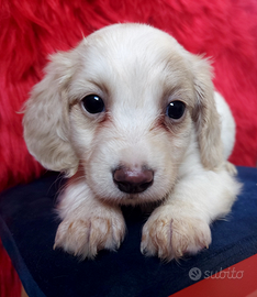 Bellissimio e particolare cucciolo maschio di bassotto nano mantello extreme piebald cream a pelo lungo , nato ai primi di gennaio e in consegna a partire dalla meta' di marzo con 2 vaccini, chip, vermughi e trattamenti antiparassitari, certificato di buona salute e certificato di origine .