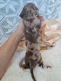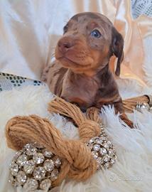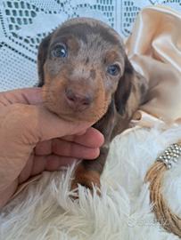 Bellissima cucciolo di bassotto tedesco a pelo corto mantello arlecchino cioccolato futura taglia nana; il piccolo e' nata il 03.03.2026 e sara' disponibile a partire dal 4 maggio con due vaccini, chip, certificato di buona salute , trattamenti x antiparassitari interni ed esterni, pedigree Aci. Entrambe I genitori sono visibili in allevamento mamma nano piccolo e papa' kaninken; Disponibile per la consegna in Italia e all'estero. Scrivere su whatsapp per un primo contatto . Grazie