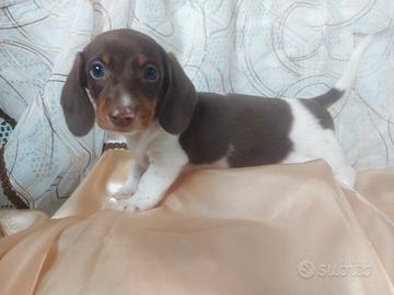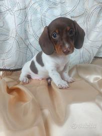 Disponibile in allevamento cucciolo di bassotto nano a pelo corto mantello piebald cioccolato con pedigree Aci nato il 23/01 e disponibile per il ritiro dalla fine di marzo con chip, 2 vaccini, certificato di buona salute , trattamenti per parassiti interni ed esterni, regolare iscrizione in anagrafe canina e passaggio di proprieta';