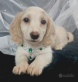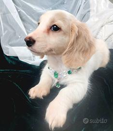 Disponibile in allevamento bellissimo cucciolo di bassotto nano mantello extreme piebald cream a pelo lungo , nato il 3i di gennaio e subito in consegna con 2 vaccini, chip, vermifughi e trattamenti antiparassitari, certificato di buona salute e certificato di origine .