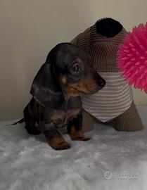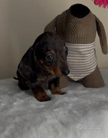 Salve, disponibile bellissimo cucciolo maschio di bassotto tedesco (kaninchen) Arlecchino Silver. Il cucciolo é nato il 26/09/2025 poco più di due mesi e attualmente pesa (750g) dimostrabili su bilancia di persona o con videochiamata; nato da papà Arlecchino cioccolato e mamma nero focato. Il cucciolo verrà ceduto con due vaccini, tre cicli di vermifugo, libretto sanitario, microchip con iscrizione all'anagrafe canina e certificato di buona salute; il cucciolo é stato allevato e cresciuto in ambito familiare, ed é inoltre già avviato a fare i bisogni sulla traversa.