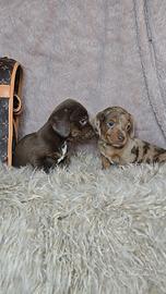 Si cedono splendide bassotto taglia nano color arlecchino cioccolato maschio 950 euro color cioccolato un maschio ed una femmina 800 euro euro con carattere dolce ed equilibrato. Informazioni sanitarie: Prima vaccinazione effettuata 2 Sverminazione Controllo veterinario generale eseguito microchip Cresciute in ambiente familiare, ben socializzate, abituate al contatto umano e ad altri animali. Usano gia la traversina. Mamma visibile PERSONALMENTE, Per informazioni, foto e visite conoscitive, contattare in privato; 3792098313