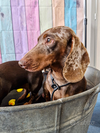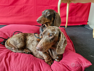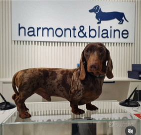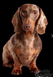 Disponibile solo per monta bassotto arlecchino cioccolato confermato in taglia nana, giovane campione italiano di bellezza, pedigree enci, test genetici clear, dna depositato, carattere equilibrato caratteristica che trasmette ai suoi figli. Già padre di bellissime cucciolate.Disponibile a trasferte. Herpes virus negativo.Genitori kaninken.