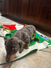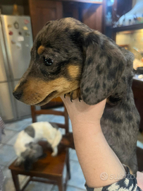 Vendo bellissimo bassotto arlecchino silver nato il 2 ottobre. Genitori di mia proprietà. NO PEDIGREE. Il cucciolo ha già eseguito il primo vaccino e sverminazione. E' disponibile per essere accolto nella nuova casa.