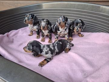 Disponibili cuccioli di Bassotto arlecchino silver Taglia kaninchen o taglia nana I cuccioli hanno 2 mesi Li cedo con il libretto sanitario, il michrochip, vaccinati e sverminati Genitori visibili Nati in casa Abituati a sporcare sulla traversina Per maggiori informazioni o appuntamento potete contattarmi al 331/4355320