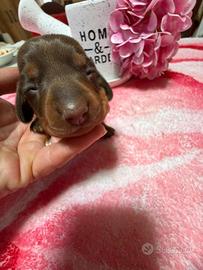 Bassotto cioccolato nano maschio nato l'11/04/26 pronto al compimento dei 60gg. Verrà ceduto col libretto sanitario rilasciato dal veterinario completo di visita di controllo,vaccinazione e 2 sverminazioni . Per info sul costo, prenotazione cuccioli o per qualsiasi altra domanda non esitate a contattarmi. Cell: +39 351 9788328