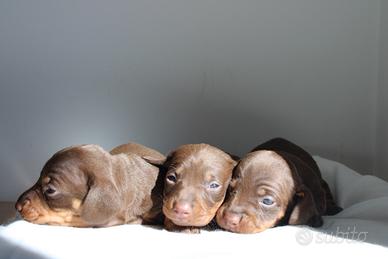 Disponibili cinque cuccioli di bassotto nano cioccolato, tre femmine e due maschi.