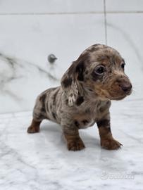 Disponibile ultimo cucciolo maschio di bassotto arlecchino cioccolato, il cucciolo viene consegnato completo di sverminazione, due vaccini microchip e pedigree ENCI. Genitori con pedigree importanti Possibilità di consegna in tutta Italia