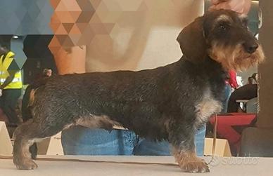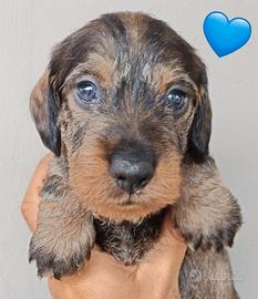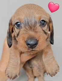 REALI IN FOTO. Disponibili cuccioli di bassotto tedesco a pelo duro, genitori entrambi confermati taglia nana,Pluri eccellenti in expo Enci e con DNA depositato.(In foto) I cuccioli verranno ceduti a partire dai 2 mesi di età sverminati, vaccinati,con microchip e pedigree ENCI,in omaggio puppy kit. Disponibili due maschi e una femmina,colore cinghiale e foglia secca (fulvo) pelo ruvido di ottima tessitura. X info tel 338-8383073