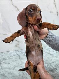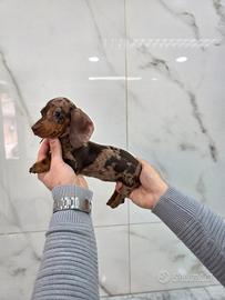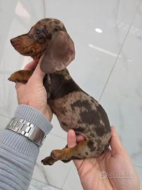 LEGGERE BENE L'ANNUNCIO prima di contattarmi. Vendo bassotto femmina arlecchino cioccolato di tre mesi con vermifughi due vaccini microchip e pedigree enci, molto probabilmente kaninchen. La cucciola ha un ernia ombelicale e inoltre gli MANCA UNA PARTE DEL PIEDE perché alla nascita la mamma per sbaglio glielo ha staccato , ma nonostante questo la cucciola è in ottima salute e cammina e corre tranquillamente. Per questi motivi la cedo a meno della metà del suo valore...se siete interessati contattatemi telefonicamente ma il prezzo è quello quindi inutile perdere tempo perché non la regalo.