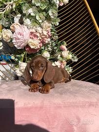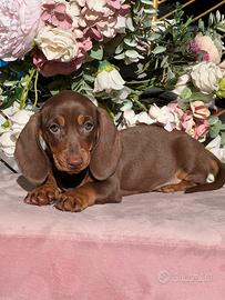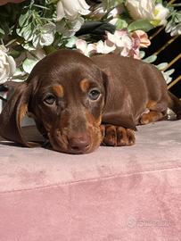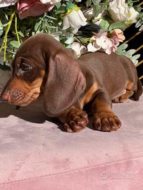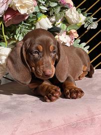 Disponibile da subito bellissima cucciola femmina di bassotto, colore cioccolato, libretto sanitario, vaccino,gia sverminata, genitori di nostra proprieta. No regalo!