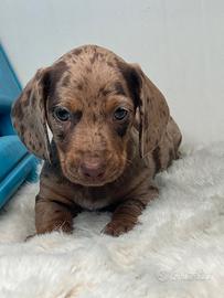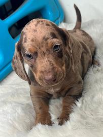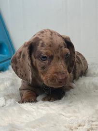 Disponibile da subito bellissimo cucciolo maschio di bassotto,colore cioccolato arlecchino,libretto sanitario,vaccino,già sverminato,genitori di nostra proprietà.No regalo!