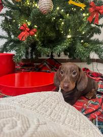Disponibile bellissimo cucciolo di bassotto tedesco color cioccolato, viste le dimensioni potrebbe essere un kaninchen o un nano piccolo, nato da genitori campioni di bellezza esenti da malattie genetiche con pedigree di alto livello.