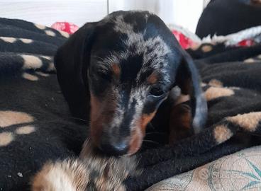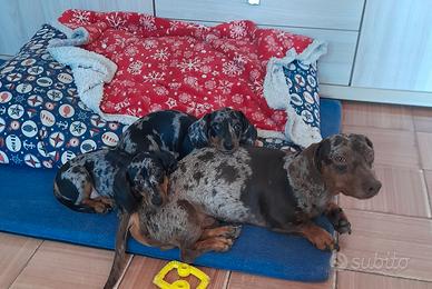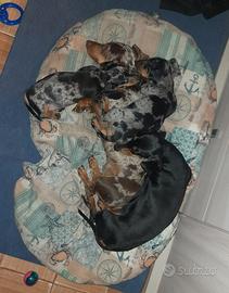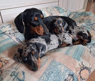 Disponibili 2 cucciole femmine di bassotto nano a pelo corto arlecchino silver, mamma nera focata e papà arlecchino cioccolato. Nate il 13 giugno 2025, accudite in ambiente familiare e amorevole con mamma e papà e i genitori umani. I cuccioli sono stati allevati con cura e passione, hanno socializzato sin dai primi giorni di vita, già seguiti da educatore Cinofilo.