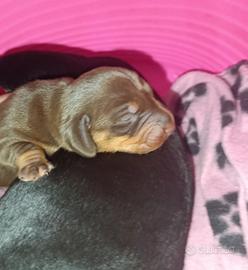 Bassotto nano color cioccolato, maschio. È nato figlio unico il 18 marzo, potrà raggiungere la sua nuova famiglia a partire dal 18 maggio. La mamma nero focato e il papà arlecchino silver sono abituati alla vita di campagna, vivono a stretto contatto con altri cani e i miei due bambini. Verrà ceduto con ciclo di vermifugo, vaccino e microchip con regolare passaggio di proprietà. Sarà giá fatto un primo antiparassitario se necessario. Astenersi perditempo Prezzo 700 euro