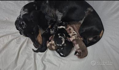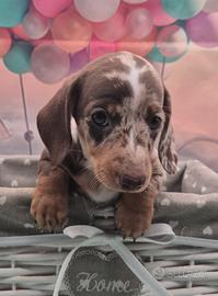 Splendida cucciolata di Bassotti nano / kaninchen , nati il 23/11/2025 arlecchino cioccolato ,nero focato e arlecchino silver nati e cresciuti amorevolmente in casa . Mamma nana arlecchino silver , papà cioccolato nano. Verranno ceduti non prima di 60/75 gg. con libretto sanitario , iscrizione anagrafe canina, vaccinazione avviata, microchip , 3 sverminazioni , test delle feci , certificato di buona salute e kit cucciolo , già abituati a sporcare sulla traversina . Solo per veri interessati . Per ulteriori informazioni contattatemi sul numero 3391690882 o messaggiare su Whats app . No ore pasti . No regalo. Vincenzo
