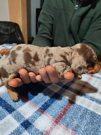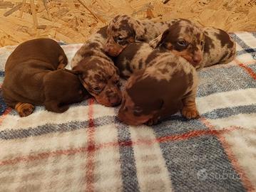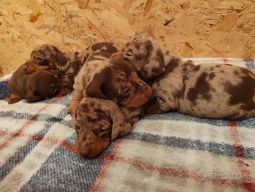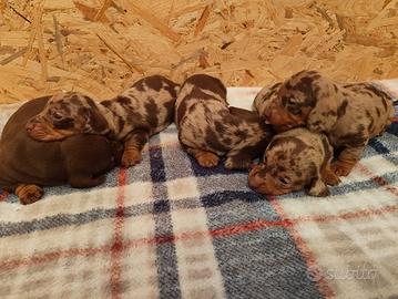 La mamma dei cuccioli è una bassotta cioccolato nana e il papà è un bassotto kaninchen arlecchino cioccolato.