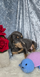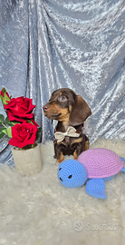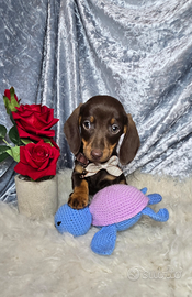 CEdono splendidi bassotti taglia nano MASCHIETTI color cioccolato con gli occhi verdi ed un colo blu con gli occhi color giagghio con carattere dolce ed equilibrato. Informazioni sanitarie: Prima vaccinazione effettuata 2 Sverminazione Controllo veterinario generale eseguito microchip Cresciute in ambiente familiare, ben socializzate, abituate al contatto umano e ad altri animali. Usano gia la traversina. Mamma visibile, Per informazioni, foto e visite conoscitive, contattare in privato; 3792098313