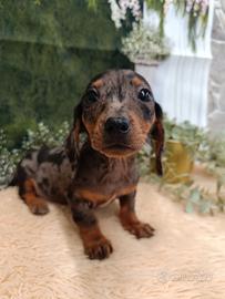 Maschietto razza Bassotto di taglia nana, Grazioso esemplare di colore silver Arlecchino, età due mesi e mezzo, sano, vivace e giocherellone è un ottimo compagno per le famiglie con bambini e un meraviglioso compagno di vita per le persone anziane.