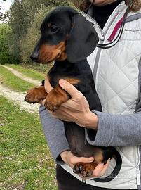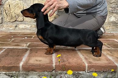 Bellissimo cucciolo di bassotto a pelo corto, proveniente da genitori di alta genealogia e' proposto in vendita da allevamento riconosciuto dall'Enci e dalla FCI. Il piccolo e' nato il 14/12/25. Ha gia' effettuato il ciclo vaccinale completo, sverminazioni, microchip, pedigree.I genitori sono testati per le malattie genetiche. E' portatore del gene del cioccolato. Possibilita' di trasporto. Informazioni con contatto telefonico.