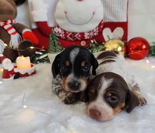 Allevamento professionale dispone di bellissimi cuccioli di bassotto taglia kaninchen colorazione piebald di 60 giorni , verranno consegnati con:
