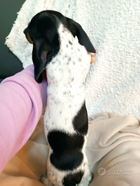Cucciolo di bassotto piebald con tiking taglia piccola da adulto non supererà i 4 kg .