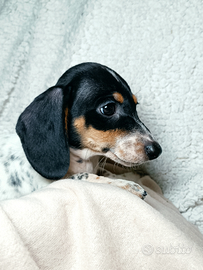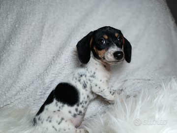 Cucciolo di bassotto piebald con tiking taglia piccola da adulto non supererà i 4 kg .