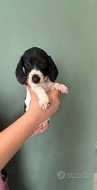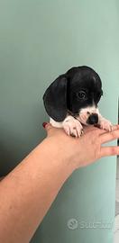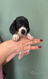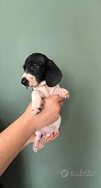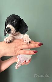 Bassotto piebald maschio black e white nato il 2 marzo. Sarà affidato con 2 vaccinazioni, 3 sverminazioni, visita medica, microchip ed iscrizione anagrafe canina, trasferimento di proprietà e box Farmina in omaggio.