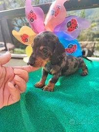 Disponibili cuccioli di bassotto Tedesco nella colorazione arlecchino silver età 75 giorni provvisti di ciclo vaccinale libretto sanitario microchip iscrizione anagrafica canina e garanzia sanitaria. Genitori entrambi visibili sul posto.