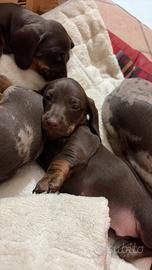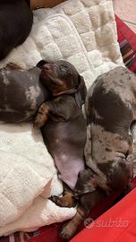 Vendesi cuccioli di bassotto tedesco nano/kaninchen arlecchino chocolate, madre kaninchen arlecchino e padre nano chocolate entrambi con pedigree ENCI di alta genealogia e conferma di taglia. I cuccioli verranno ceduti sverminati, con microchip e pedigree ENCI. Chocolate 1600€ e Arlecchino 2200€ Per eventuali foto/video contattare via whatsapp al 3474438913