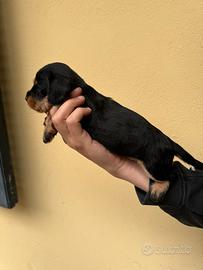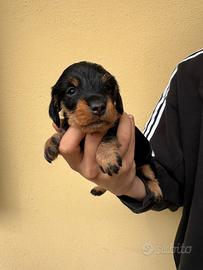 Femmina di bassotto tedesco pelo duro nero focata taglia kaninchen, cedesi con pedigree enci FCI microchip vaccino vermifugo libretto sanitario e puppy kit. Figlia di multi campione di bellezza e lavoro entrambi i genitori testati geneticamente. Visibile senza impegno in provincia di Pavia o vicino a Savona.