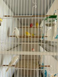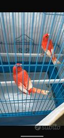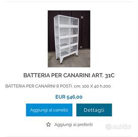 Vendo batteria da 8 gabbie acquistata lo scorso gennaio con 7 coppie di splendidi canarini di colore anno 2025 acquistati da rinomati allevatori nel cosentino. Maschi: 2 bianco recessivo,1 giallo intenso portatore occhi rossi, 2 giallo brinato,1 mosaico rosso, 1 rosso brinato. Femmine: 1 giallo intenso,1 giallo avorio, 1 giallo brinato, 1 mosaico rosso satinè occhi rossi, 1 rosso intenso, 2 bianco recessivo. Non sono , ovviamente, ancora in riproduzione. Vendo solo in blocco con batteria a 600 euro. Vendo esclusivamente per motivi lavorativi che mi costringono a spostamenti frequenti. 3518646767