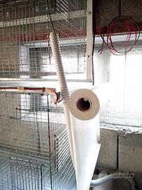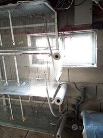 Batteria di gabbie a parete con sistema rotolo carta scorrevole e vassoio in lamiera.sistema formato da un telaio da fissare al muro e da 6 gabbie,le gabbie si possono sfilare tirandole avanti.La gabbia singola misura cm101x41xh45 .Lo sportello grande è a ghigliottina, altri sportelli hanno misure compatibili x mangiatoie antispreco,bagnetti,nidi e sportelli piccoli x sali minerali etc.La griglia del fondo si può sfilare e per cambiarla è facile sulla guida c'è spazio per 2 griglie basta inserire prima quella pulita sopra e poi si sfila quella sporca da sotto.