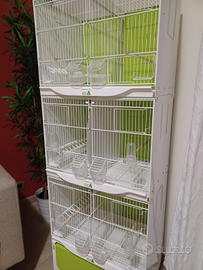 Accessori: 3 grandi mangiatoie interne con supporto, 6 mangiatoie esterne, 3 beverini, 6 posatoi, 3 divisori a griglia e 3 ciechi.