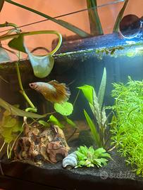 Prezzo: 15 € Descrizione: Vendo splendido Betta maschio dalle pinne lunghe tipo Halfmoon, colorazione giallo/oro con riflessi chiari. È in ottima salute, molto attivo e abituato a vivere in acquario con piante naturali. Il pesce è ideale sia per chi è alle prime armi sia per appassionati. Mangia regolarmente (granuli e cibo congelato) e non presenta alcun problema. Caratteristiche: * Colore: giallo/oro * Pinne ampie e ben sviluppate * Temperamento vivace (come tipico dei Betta, da tenere da solo) Condizioni di vendita: * Solo ritiro a mano * Non spedisco per garantire il benessere dell'animale Per qualsiasi informazione o foto aggiuntive, scrivimi pure!