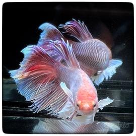 Femmina Halfmoon Dragon Scale, con corpo perlato e squame marcate, pinne eleganti dai toni rosati e bianchi con riflessi metallici.