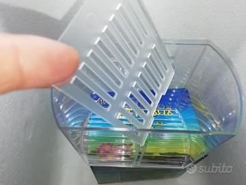 Bettiera a 4 scomparti, in plastica con coperchio, divisori removibili e ventose per attaccarla in acquario, prezzo 15 euro.