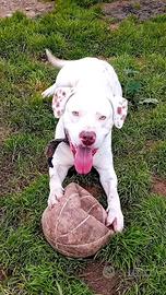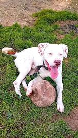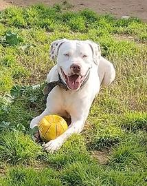 DOGO/PITBULL INCR., BLANCO, 1 ANNO E MEZZO, ABBANDONDATO DAVANTI AD UN BAR. CERCA CASA