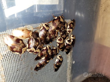 Blatte di porcellana (Gyna centurio), alimentate con carote, frutta e crocchette per gatti.