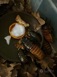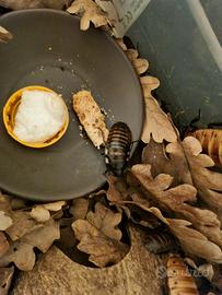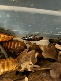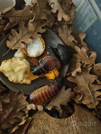 Blatte giganti del Madagascar (Gromphadorhina portentosa) subadulte di circa 3-3,5 cm, nate a gennaio. Molto attive e sane, allevate in ambiente controllato. Ideali per terrario o allevamento. Disponibili subito. In foto anche gli adulti genitori.