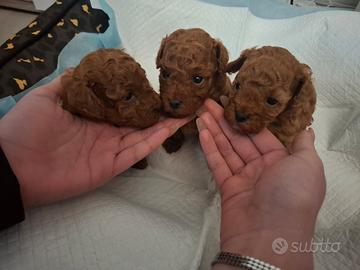 Salve , disponibili dal 10 maggio barboncino toy maschio e femmina nati il 16 febbraio . Madre 23cm al garese e 2800 gr. padre 1900 gr . Color rosso saranno vaccinati e sverminati