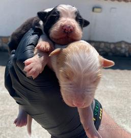 Vendo 2 cuccioli di Border collie (anche separatamente). Entrambi maschi. Uno bianco e nero e uno gold. Padre a madre visibili in foto (mamma marrone e bianca e papà blue merlè). I cuccioli saranno ceduti dopo 60 giorni, sverminati. Nati il 15 Aprile 2026. Solo persone realmente interessate che abbiano la passione per i cani.