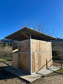 Box cavalli 3mtx3 da esterno. Struttura portante in acciaio zincato a caldo, con tamponamento delle pareti in tavole M-F di larice. Copertura in pannello coibentato termoisolante. Comprato nuovo a settembre 2025