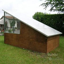 - cuccia interna in legno (da 125 x 65 x 85h, con ingresso "antimorso" da 27 x 47h), ispezionabile sollevando il tettino e completa di pedana rialzata da terra, estraibile e lavabile