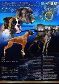 Nuova cucciolata di altissima genealogia, con caratteristiche da esposizione, padre campione di esposizione nazionale vincitore di Classe lavoro al campionato di morfologia Boxer club italia, controlli ufficiali sanitari perfetti di entrambi i genitori in: -Displasia A, B -Spondilosi 0 -Cuore Ufficiale di entrambi i genitori Perfetto esente da qualsiasi cardiopatia congenita. I cuccioli verranno ceduti dai 65 giorni in poi con: -Microchip e iscrizione anagrafe canina -Pedigree ufficiale ENCI -3 sverminazioni -2 Vaccinazioni (parvo e 1 dose eptavalente virbac) -Libretto sanitario -Certificato di Buona Salute -Kit Cucciolo Non esitate a contattarmi per le foto ufficiali dei genitori o i dati sanitari ufficiali consultabili anche ufficialmente sul sito ENCI o Boxer Club italia