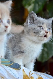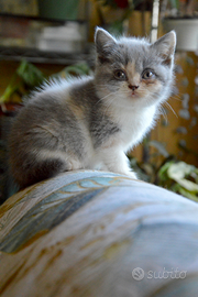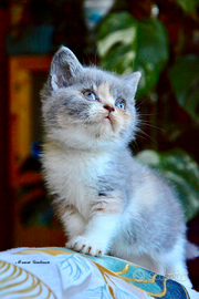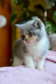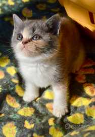 Vendo cucciola di razza British Shorthair tricolor. La gattina verrà ceduta al termine dello svezzamento, a tre mesi di vita, già abituata all'uso della lettiera e del tiragraffi, con ciclo completo di vaccinazioni e trattamento antiparassitari, visita veterinaria, libretto sanitario, pedigree.