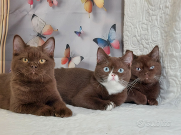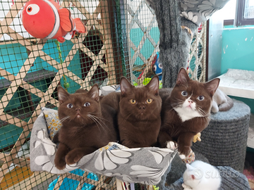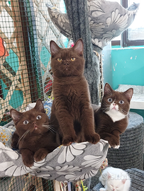 British Shorthair colore Chocolat portatore cinamon.Una femmina e due maschietti, nati il 30.04.25 Maschio con occhi ambra 1000, con occhi azzurri 1500.