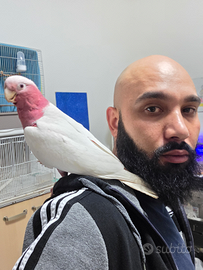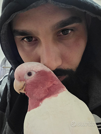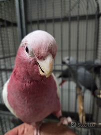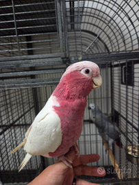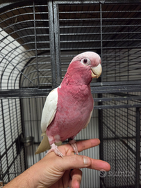 Disponibile un esemplare di Cacatua galah con mutazione Lutina, una colorazione molto rara e particolarmente ricercata. Soggetto sano, cresciuto con attenzione e abituato al contatto umano, dal carattere docile ed equilibrato.